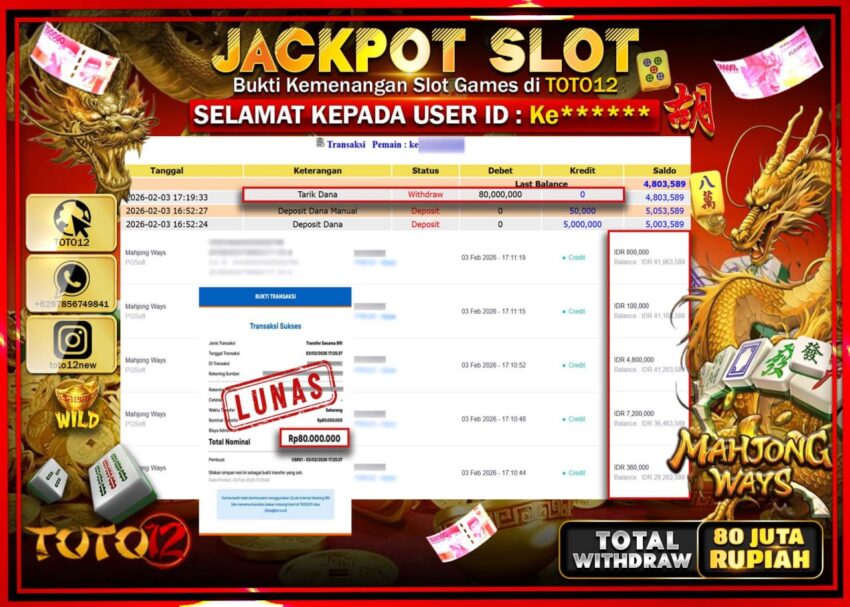HANYA DI TOTO12 JP PASTI DI BAYAR LUNAS DAN CEPAT!!!!!! JACKPOT SLOT GAME (MAHJONG WAYS) Rp.80.000.000 !!!!