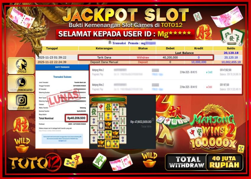 Selamat kepada Member Kami Mg****** Telah Jackpot dan berhasil mendapatkan kemenangan besar pada permainan JACKPOT SLOT GAME (MAHJONG WINS 2)  Dengan Kemenangan Sebesar Rp.40.200.000 –.  Setelah mengisi Fomulir Withdraw dengan Kurang waktu 1-2 Menit Dana sudah kami Trasnfer kepada Pemilik Userid dan dana sudah dapat di cairkan oleh pemenang. Bukti Pembayaran yang TOTO12 berikan merupakan Bukti Pembayaran yang  SAH / VALID yang langsung Di dapatkan melalui transaksi dari Bank yang di Tunju.