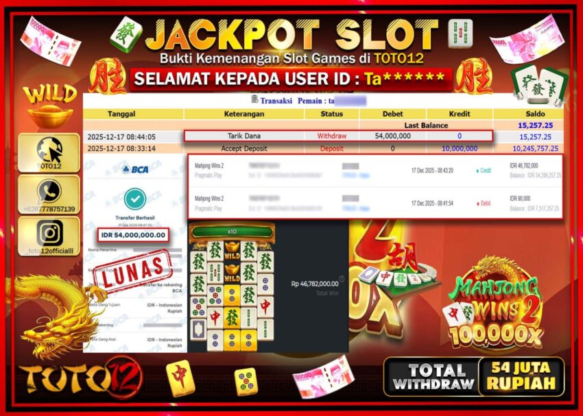 HANYA DI TOTO12 JP PASTI DI BAYAR LUNAS DAN CEPAT!!!!!! JACKPOT SLOT GAME (MAHJONG WINS 2) Rp.54.000.000 !!!!