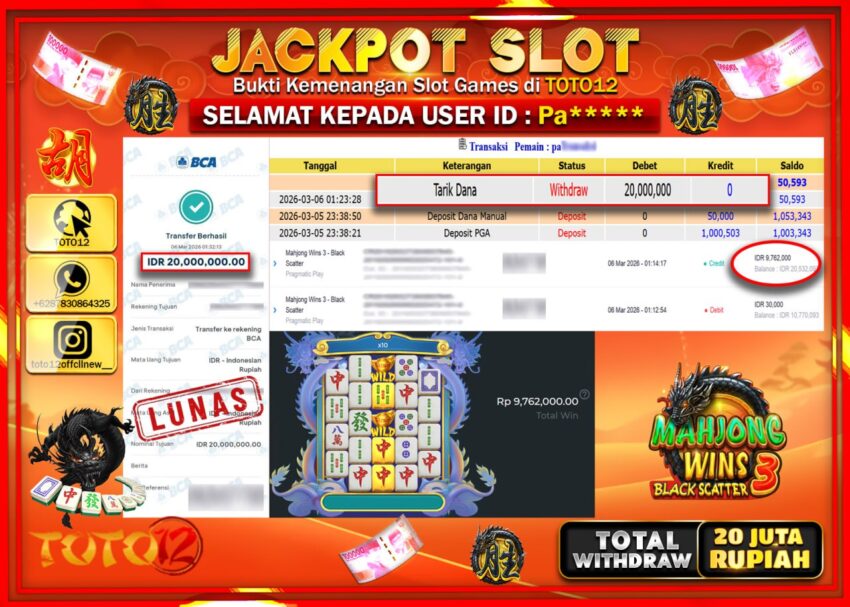 Selamat kepada Member Kami Pa**** Telah Jackpot dan berhasil mendapatkan kemenangan besar pada permainan JACKPOT SLOT GAME (MAHJONG WINS 3 BLACK SCATTER 3)) Dengan Kemenangan Sebesar Rp.20.000.000–.