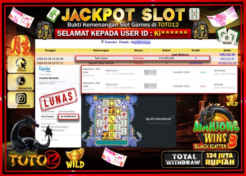 Selamat kepada Member Kami Ki**** Telah Jackpot dan berhasil mendapatkan kemenangan besar pada permainan JACKPOT SLOT GAME (MAHJONG WINS 3 BLACK SCATTER) Dengan Kemenangan Sebesar Rp.134.500.000–.