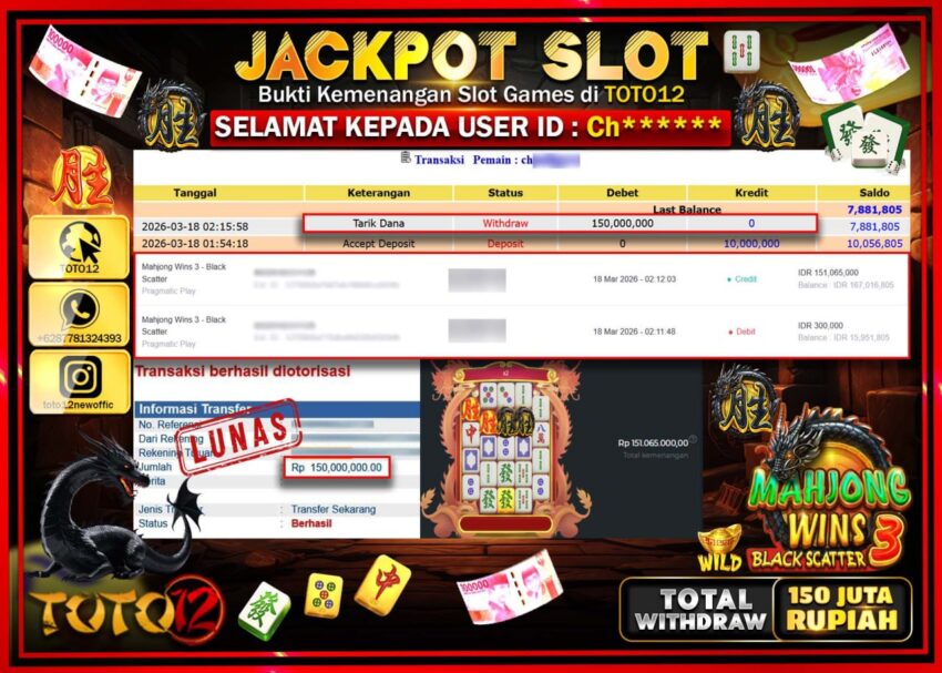 HANYA DI TOTO12 JP PASTI DI BAYAR LUNAS DAN CEPAT!!!!!! JACKPOT SLOT GAME (MAHJONG WINS 3 BLACK SCATTER) Rp.150.000.000!!!!
