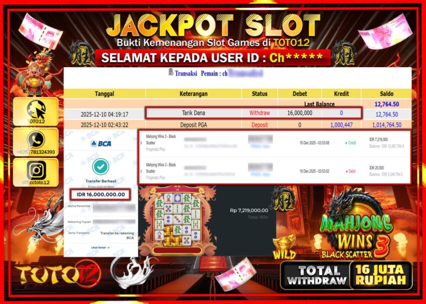 Selamat kepada Member Kami Ch****** Telah Jackpot dan berhasil mendapatkan kemenangan besar pada permainan JACKPOT SLOT GAME (MAHJONG WINS 3 BLACK SCATTER) Dengan Kemenangan Sebesar Rp.16.000.000 –.