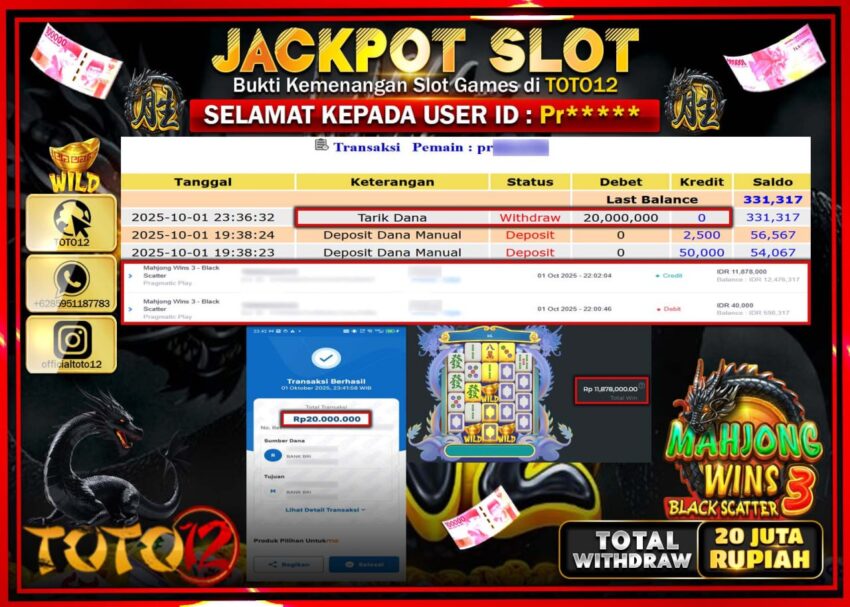 Selamat kepada Member Kami Pr****** Telah Jackpot dan berhasil mendapatkan kemenangan besar pada permainan JACKPOT SLOT GAME (MAHJONG WINS 3 BLACK SCATTER) Dengan Kemenangan Sebesar Rp.20.000.000 –. Setelah mengisi Fomulir Withdraw dengan Kurang waktu 1-2 Menit Dana sudah kami Trasnfer kepada Pemilik Userid dan dana sudah dapat di cairkan oleh pemenang. Bukti Pembayaran yang TOTO12 berikan merupakan Bukti Pembayaran yang SAH / VALID yang langsung Di dapatkan melalui transaksi dari Bank yang di Tunju.