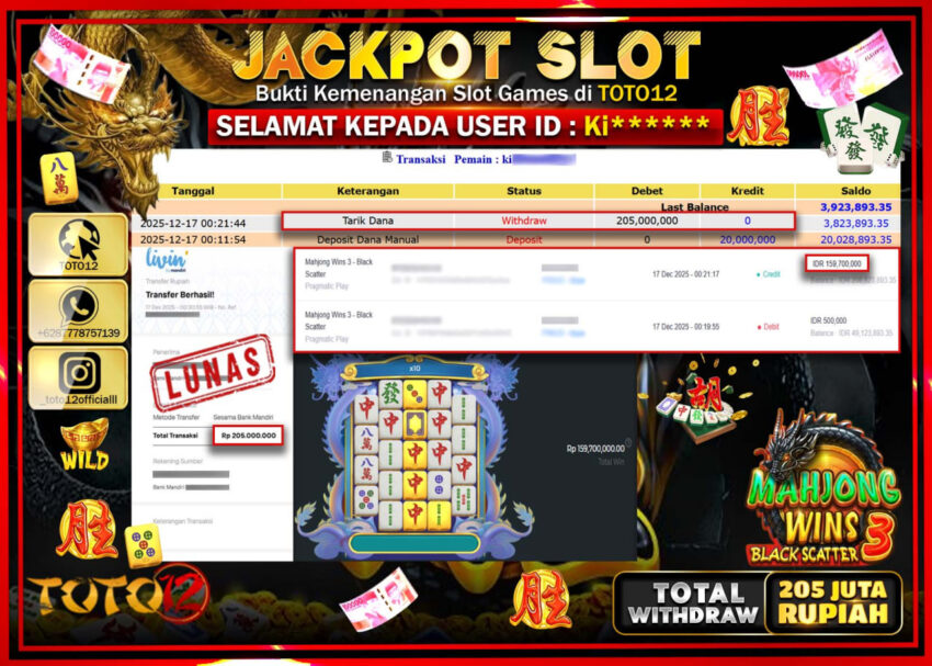 HANYA DI TOTO12 JP PASTI DI BAYAR LUNAS DAN CEPAT!!!!!! JACKPOT SLOT GAME (MAHJONG WINS 3 BLACK SCATTER) Rp.205.000.000 !!!!