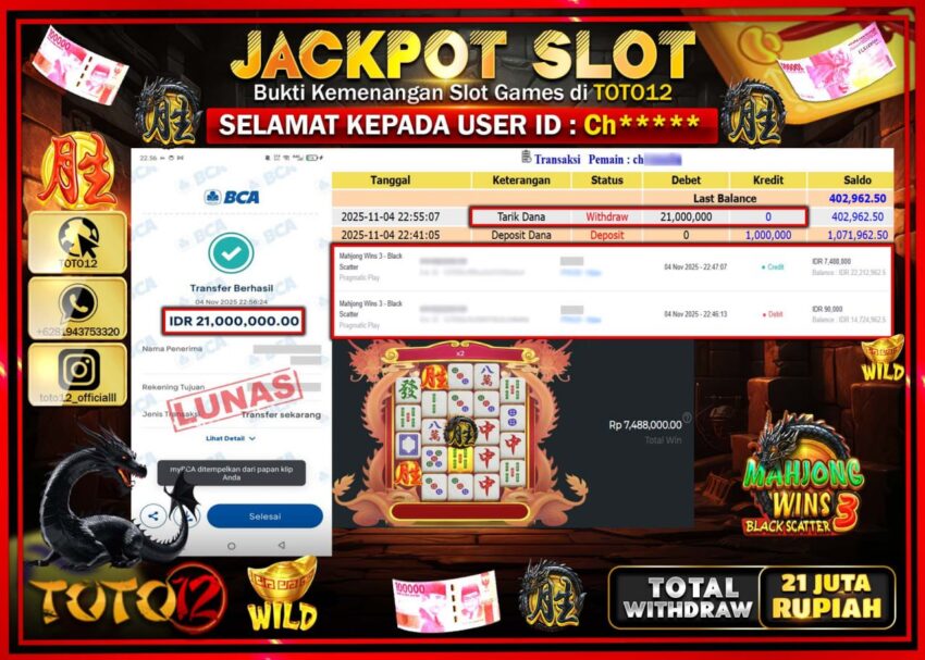 Selamat kepada Member Kami Ch****** Telah Jackpot dan berhasil mendapatkan kemenangan besar pada permainan JACKPOT SLOT GAME (MAHJONG WINS 3 BLACK SCATTER) Dengan Kemenangan Sebesar Rp.21.000.000 –. Setelah mengisi Fomulir Withdraw dengan Kurang waktu 1-2 Menit Dana sudah kami Trasnfer kepada Pemilik Userid dan dana sudah dapat di cairkan oleh pemenang. Bukti Pembayaran yang TOTO12 berikan merupakan Bukti Pembayaran yang SAH / VALID yang langsung Di dapatkan melalui transaksi dari Bank yang di Tunju.