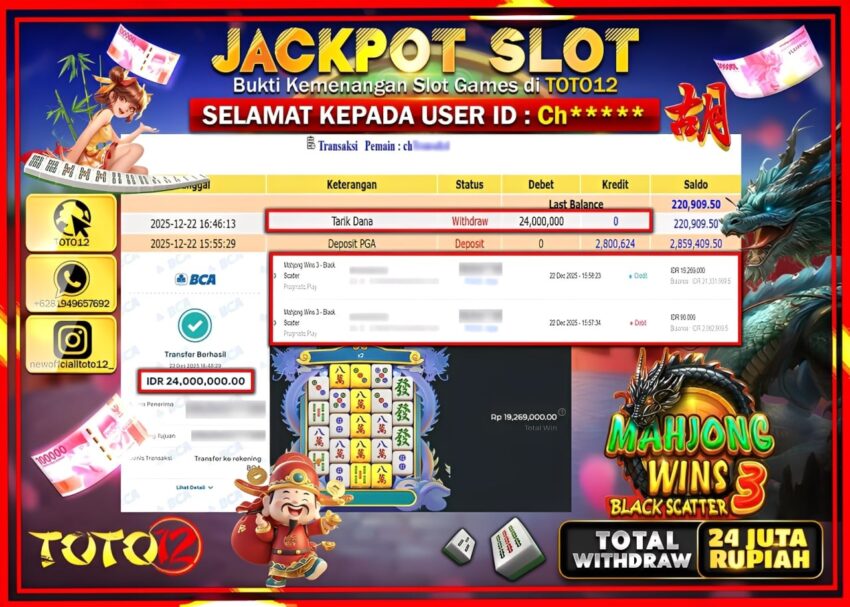 HANYA DI TOTO12 JP PASTI DI BAYAR LUNAS DAN CEPAT!!!!!! JACKPOT SLOT GAME (MAHJONG WINS 3 BLACK SCATTER) Rp.24.000.000 !!!!