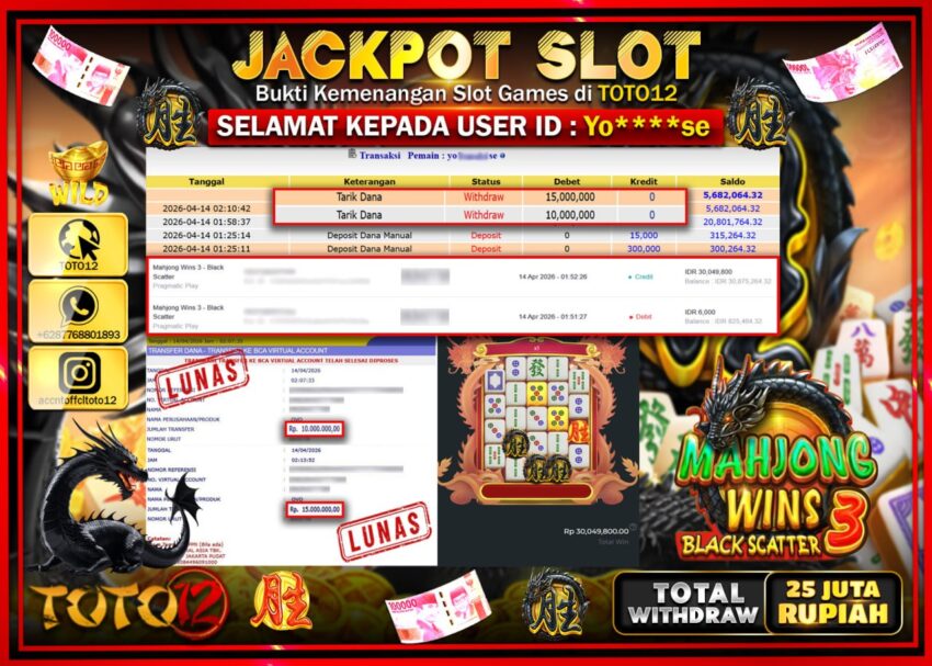 Selamat kepada Member Kami Yo*****se Telah Jackpot dan berhasil mendapatkan kemenangan besar pada permainan JACKPOT SLOT GAME  (MAHJONG WINS 3 BLACK SCATTER)  Dengan Kemenangan Sebesar Rp.25.000.000–.