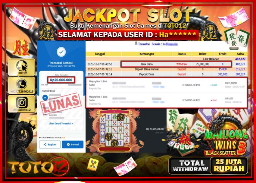 Selamat kepada Member Kami Ha****** Telah Jackpot dan berhasil mendapatkan kemenangan besar pada permainan JACKPOT SLOT GAME (MAHJONG WINS 3 BLACK SCATTER) Dengan Kemenangan Sebesar Rp.25.000.000 –. Setelah mengisi Fomulir Withdraw dengan Kurang waktu 1-2 Menit Dana sudah kami Trasnfer kepada Pemilik Userid dan dana sudah dapat di cairkan oleh pemenang. Bukti Pembayaran yang TOTO12 berikan merupakan Bukti Pembayaran yang SAH / VALID yang langsung Di dapatkan melalui transaksi dari Bank yang di Tunju.