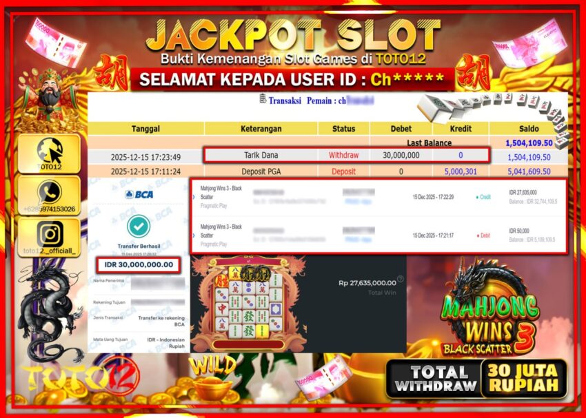 Selamat kepada Member Kami Ch****** Telah Jackpot dan berhasil mendapatkan kemenangan besar pada permainan JACKPOT SLOT GAME (MAHJONG WINS 3 BLACK SCATTER) Dengan Kemenangan Sebesar Rp.30.000.000 –.