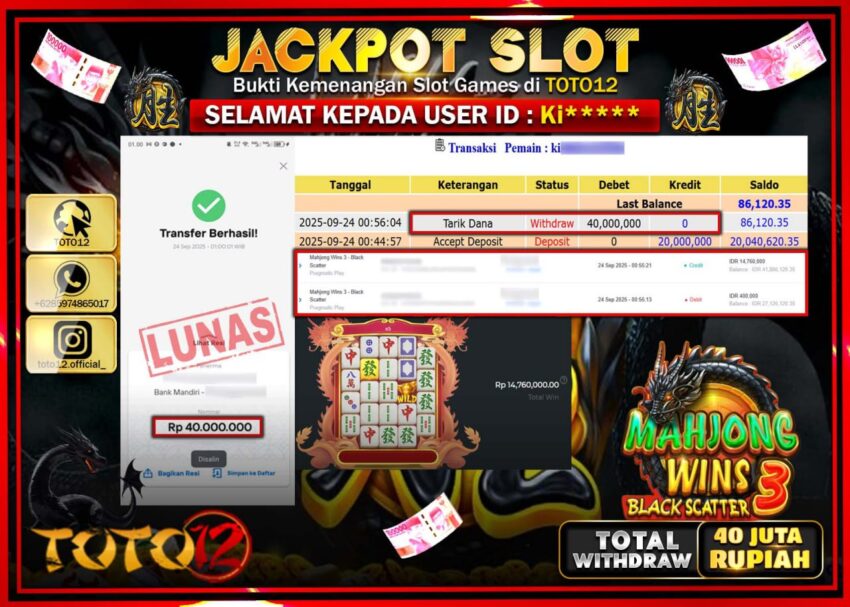 Selamat kepada Member Kami Ki****** Telah Jackpot dan berhasil mendapatkan kemenangan besar pada permainan JACKPOT SLOT GAME (MAHJONG WINS 3 BLACK SCATTER) Dengan Kemenangan Sebesar Rp.40.000.000 –. Setelah mengisi Fomulir Withdraw dengan Kurang waktu 1-2 Menit Dana sudah kami Trasnfer kepada Pemilik Userid dan dana sudah dapat di cairkan oleh pemenang. Bukti Pembayaran yang TOTO12 berikan merupakan Bukti Pembayaran yang SAH / VALID yang langsung Di dapatkan melalui transaksi dari Bank yang di Tunju.
