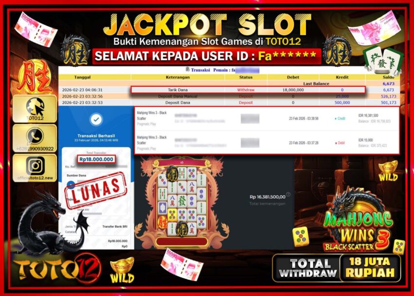 HANYA DI TOTO12 JP PASTI DI BAYAR LUNAS DAN CEPAT!!!!!! JACKPOT SLOT GAME (MAHJONG WIS 3 BLACK SCATTER) Rp.18.000.000!!!!