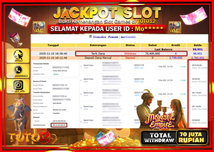 Selamat kepada Member Kami Mo****** Telah Jackpot dan berhasil mendapatkan kemenangan besar pada permainan JACKPOT SLOT GAME (MAJESTIC EMPIRE) Dengan Kemenangan Sebesar Rp.70.400.000 –. Setelah mengisi Fomulir Withdraw dengan Kurang waktu 1-2 Menit Dana sudah kami Trasnfer kepada Pemilik Userid dan dana sudah dapat di cairkan oleh pemenang. Bukti Pembayaran yang TOTO12 berikan merupakan Bukti Pembayaran yang SAH / VALID yang langsung Di dapatkan melalui transaksi dari Bank yang di Tunju.