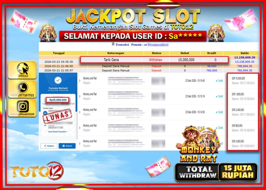 Selamat kepada Member Kami Sa**** Telah Jackpot dan berhasil mendapatkan kemenangan besar pada permainan JACKPOT SLOT GAME (MONKEY AND RAT) Dengan Kemenangan Sebesar Rp.15.000.000–.