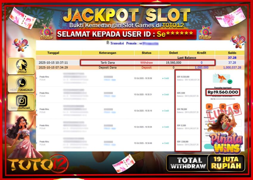 Selamat kepada Member Kami Se****** Telah Jackpot dan berhasil mendapatkan kemenangan besar pada permainan JACKPOT SLOT GAME (PINATA WINS) Dengan Kemenangan Sebesar Rp.19.560.000 –. Setelah mengisi Fomulir Withdraw dengan Kurang waktu 1-2 Menit Dana sudah kami Trasnfer kepada Pemilik Userid dan dana sudah dapat di cairkan oleh pemenang. Bukti Pembayaran yang TOTO12 berikan merupakan Bukti Pembayaran yang SAH / VALID yang langsung Di dapatkan melalui transaksi dari Bank yang di Tunju.