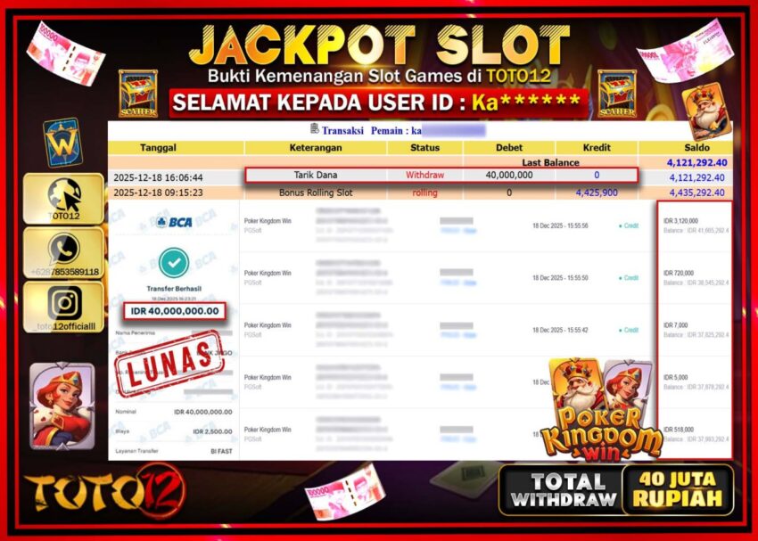 Selamat kepada Member Kami Ka****** Telah Jackpot dan berhasil mendapatkan kemenangan besar pada permainan JACKPOT SLOT GAME (POKER KINGDOM WIN) Dengan Kemenangan Sebesar Rp.40.000.000 –.