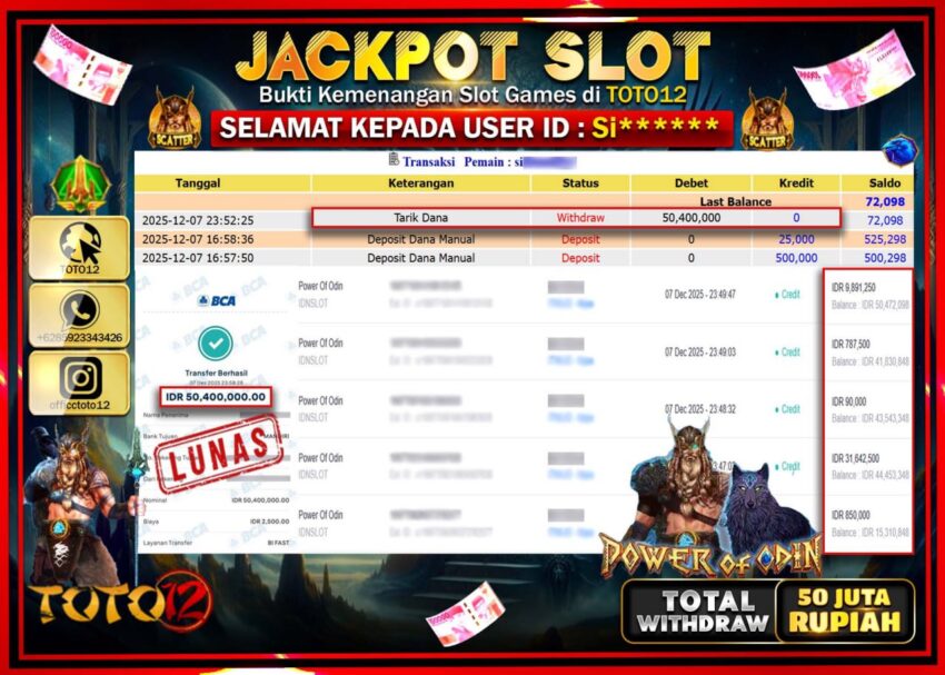 Selamat kepada Member Kami Si****** Telah Jackpot dan berhasil mendapatkan kemenangan besar pada permainan JACKPOT SLOT GAME (POWER OF ODIN) Dengan Kemenangan Sebesar Rp.50.400.000 –.