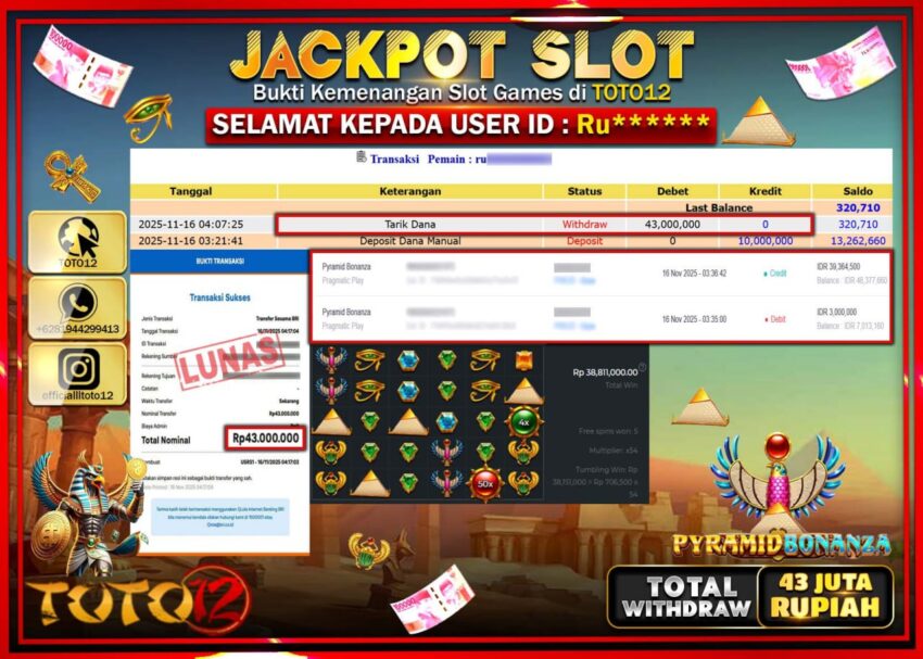 Selamat kepada Member Kami Ru****** Telah Jackpot dan berhasil mendapatkan kemenangan besar pada permainan JACKPOT SLOT GAME (PYRAMID BONANZA)  Dengan Kemenangan Sebesar Rp.43.000.000 –.  Setelah mengisi Fomulir Withdraw dengan Kurang waktu 1-2 Menit Dana sudah kami Trasnfer kepada Pemilik Userid dan dana sudah dapat di cairkan oleh pemenang. Bukti Pembayaran yang TOTO12 berikan merupakan Bukti Pembayaran yang  SAH / VALID yang langsung Di dapatkan melalui transaksi dari Bank yang di Tunju.