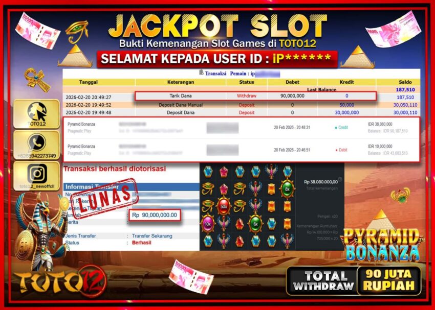 Selamat kepada Member Kami iP***** Telah Jackpot dan berhasil mendapatkan kemenangan besar pada permainan JACKPOT SLOT GAME  (PYRAMID BONANZA)  Dengan Kemenangan Sebesar Rp.90.000.000–.