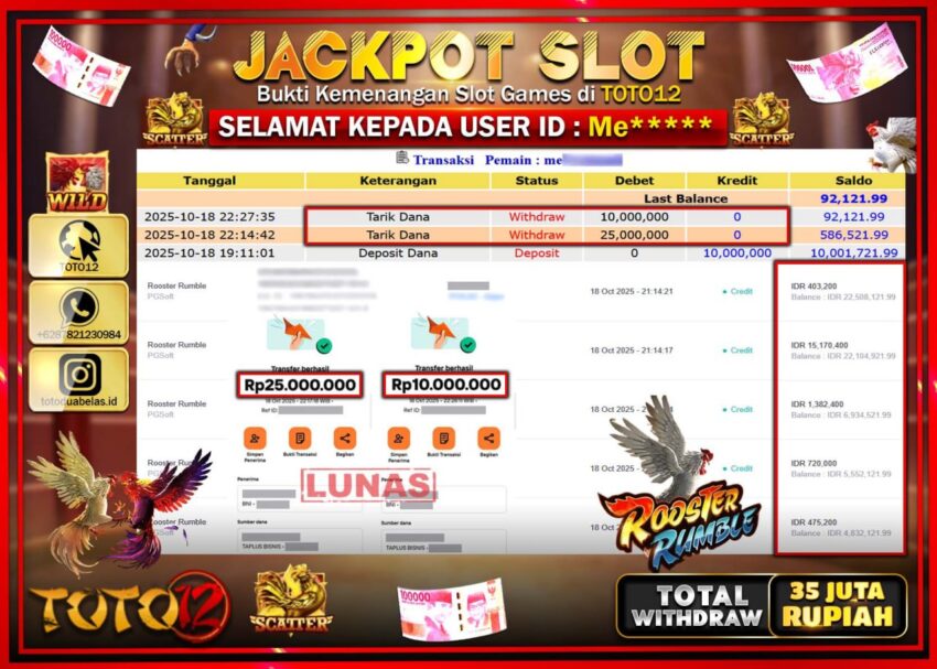 Selamat kepada Member Kami Me****** Telah Jackpot dan berhasil mendapatkan kemenangan besar pada permainan JACKPOT SLOT GAME (ROOSTER RUMBLE) Dengan Kemenangan Sebesar Rp.35.000.000 –. Setelah mengisi Fomulir Withdraw dengan Kurang waktu 1-2 Menit Dana sudah kami Trasnfer kepada Pemilik Userid dan dana sudah dapat di cairkan oleh pemenang. Bukti Pembayaran yang TOTO12 berikan merupakan Bukti Pembayaran yang SAH / VALID yang langsung Di dapatkan melalui transaksi dari Bank yang di Tunju.