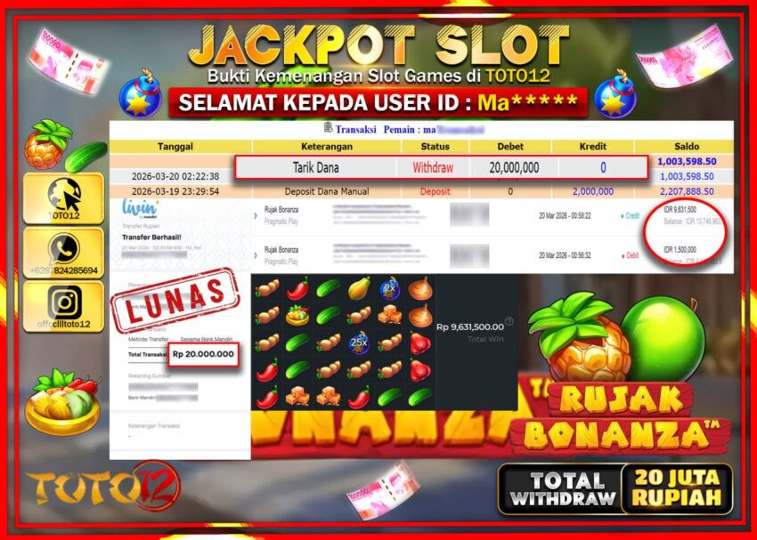 Selamat kepada Member Kami Ma**** Telah Jackpot dan berhasil mendapatkan kemenangan besar pada permainan JACKPOT SLOT GAME (RUJAK BONANZA) Dengan Kemenangan Sebesar Rp.20.000.000–.