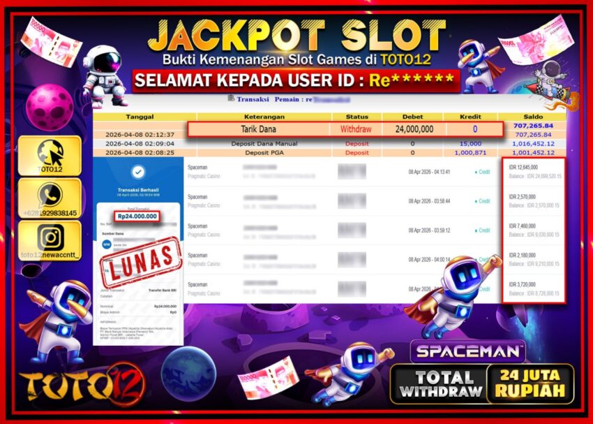 Selamat kepada Member Kami Re***** Telah Jackpot dan berhasil mendapatkan kemenangan besar pada permainan JACKPOT SLOT GAME (SPACEMAN) Dengan Kemenangan Sebesar Rp.24.000.000–.