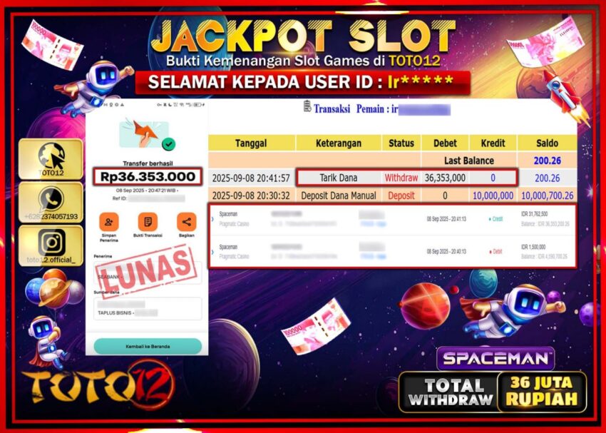 Selamat kepada Member Kami Ir****** Telah Jackpot dan berhasil mendapatkan kemenangan besar pada permainan JACKPOT SLOT GAME (SPACEMAN) Dengan Kemenangan Sebesar Rp.36.353.000 –. Setelah mengisi Fomulir Withdraw dengan Kurang waktu 1-2 Menit Dana sudah kami Trasnfer kepada Pemilik Userid dan dana sudah dapat di cairkan oleh pemenang. Bukti Pembayaran yang TOTO12 berikan merupakan Bukti Pembayaran yang SAH / VALID yang langsung Di dapatkan melalui transaksi dari Bank yang di Tunju.