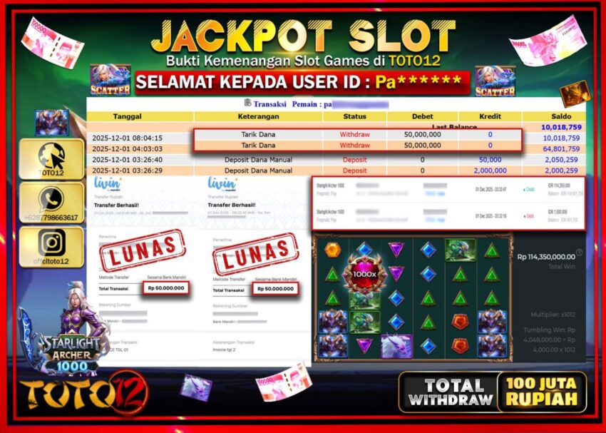 • HANYA DI TOTO12 JP PASTI DI BAYAR LUNAS DAN CEPAT!!!!!! JACKPOT SLOT GAME (STARLIGHT ARCHER 1000) Rp.100.000.000 !!!!