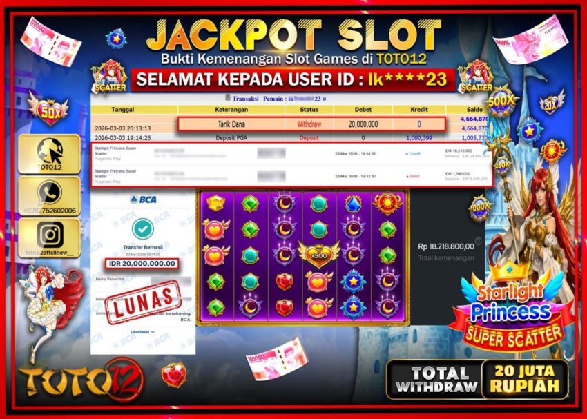 Selamat kepada Member Kami Ik****23 Telah Jackpot dan berhasil mendapatkan kemenangan besar pada permainan JACKPOT SLOT GAME (STARLIGHT PRINCES SUPER SCATTER) Dengan Kemenangan Sebesar Rp.20.000.000–.