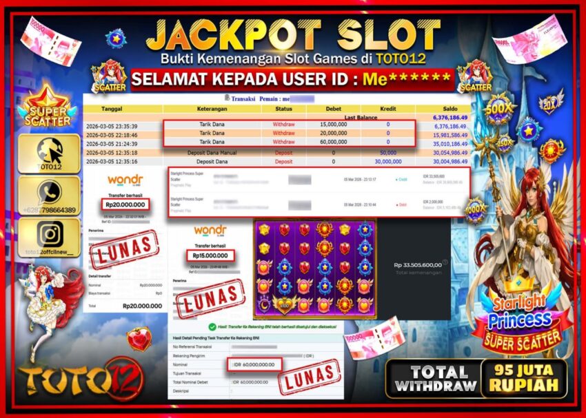 Selamat kepada Member Kami Me**** Telah Jackpot dan berhasil mendapatkan kemenangan besar pada permainan JACKPOT SLOT GAME (STARLIGHT PRINCES SUPER SCATTER) Dengan Kemenangan Sebesar Rp.95.000.000–.