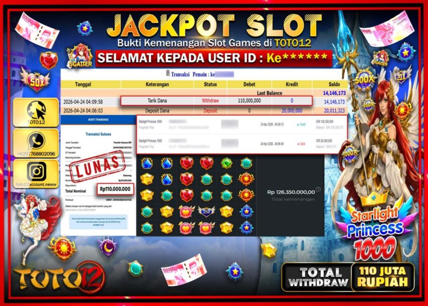 Selamat kepada Member Kami Ke***** Telah Jackpot dan berhasil mendapatkan kemenangan besar pada permainan JACKPOT SLOT GAME (STARLIGHT PRINCESS 1000) Dengan Kemenangan Sebesar Rp.110.000.000–.