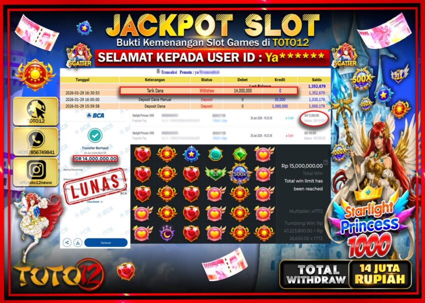 Selamat kepada Member Kami Ya****** Telah Jackpot dan berhasil mendapatkan kemenangan besar pada permainan JACKPOT SLOT GAME (STARLIGHT PRINCESS 1000) Dengan Kemenangan Sebesar Rp.14.000.000 –.