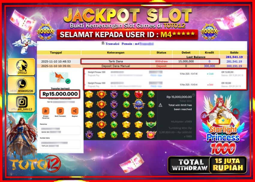 Selamat kepada Member Kami M4****** Telah Jackpot dan berhasil mendapatkan kemenangan besar pada permainan JACKPOT SLOT GAME (STARLIGHT PRINCESS 1000)  Dengan Kemenangan Sebesar Rp.15.000.000 –.  Setelah mengisi Fomulir Withdraw dengan Kurang waktu 1-2 Menit Dana sudah kami Trasnfer kepada Pemilik Userid dan dana sudah dapat di cairkan oleh pemenang. Bukti Pembayaran yang TOTO12 berikan merupakan Bukti Pembayaran yang  SAH / VALID yang langsung Di dapatkan melalui transaksi dari Bank yang di Tunju.