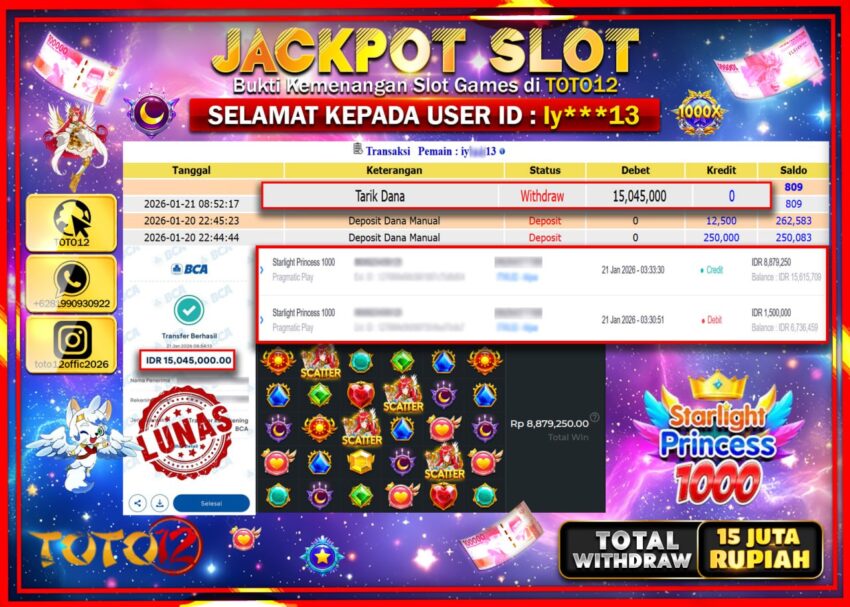 Selamat kepada Member Kami Iy****** Telah Jackpot dan berhasil mendapatkan kemenangan besar pada permainan JACKPOT SLOT GAME (STARLIGHT PRINCESS 1000)  Dengan Kemenangan Sebesar Rp.15.045.000 –.