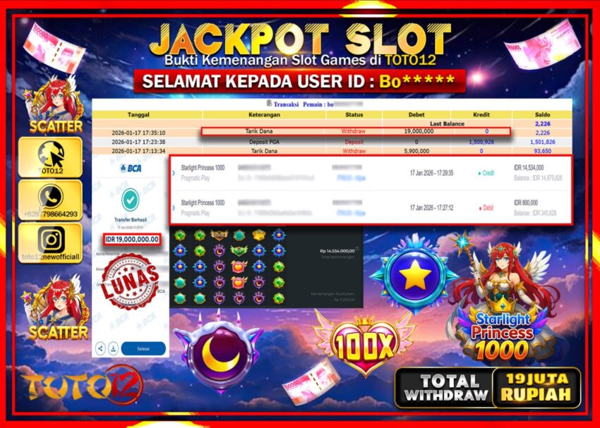 Selamat kepada Member Kami Bo****** Telah Jackpot dan berhasil mendapatkan kemenangan besar pada permainan JACKPOT SLOT GAME (STARLIGHT PRINCESS 1000)  Dengan Kemenangan Sebesar Rp.19.000.000 –.