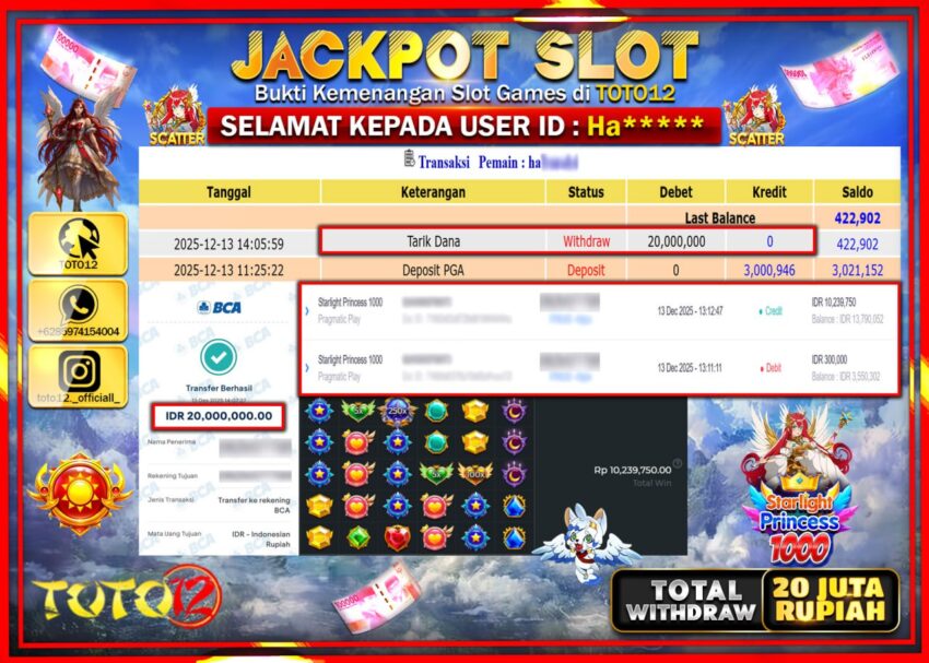 Selamat kepada Member Kami Ha****** Telah Jackpot dan berhasil mendapatkan kemenangan besar pada permainan JACKPOT SLOT GAME (STARLIGHT PRINCESS 1000) Dengan Kemenangan Sebesar Rp.20.000.000 –.
