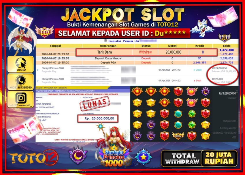 HANYA DI TOTO12 JP PASTI DI BAYAR LUNAS DAN CEPAT!!!!!! JACKPOT SLOT GAME (STARLIGHT PRINCESS 1000) Rp.20.000.000!!!!