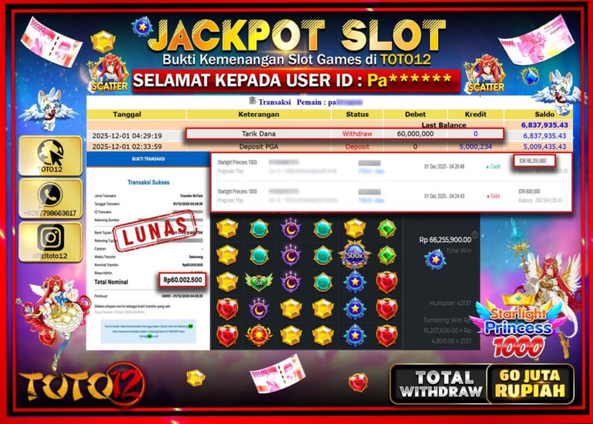 HANYA DI TOTO12 JP PASTI DI BAYAR LUNAS DAN CEPAT!!!!!! JACKPOT SLOT GAME (STARLIGHT PRINCESS 1000) Rp.60.000.000 !!!!