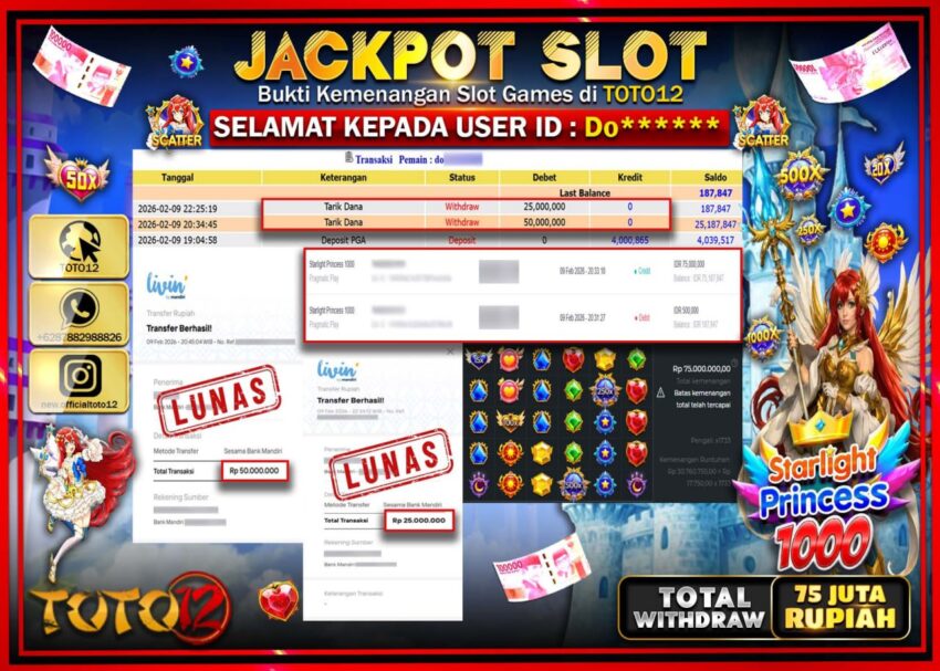 Selamat kepada Member Kami Do***** Telah Jackpot dan berhasil mendapatkan kemenangan besar pada permainan JACKPOT SLOT GAME (STARLIGHT PRINCESS 1000) Dengan Kemenangan Sebesar Rp.75.000.000–.