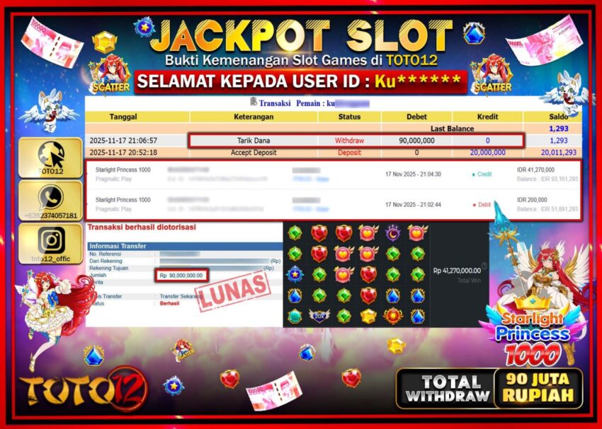 Selamat kepada Member Kami Ku****** Telah Jackpot dan berhasil mendapatkan kemenangan besar pada permainan JACKPOT SLOT GAME (STARLIGHT PRINCESS 1000)  Dengan Kemenangan Sebesar Rp.90.000.000 –.  Setelah mengisi Fomulir Withdraw dengan Kurang waktu 1-2 Menit Dana sudah kami Trasnfer kepada Pemilik Userid dan dana sudah dapat di cairkan oleh pemenang. Bukti Pembayaran yang TOTO12 berikan merupakan Bukti Pembayaran yang  SAH / VALID yang langsung Di dapatkan melalui transaksi dari Bank yang di Tunju.