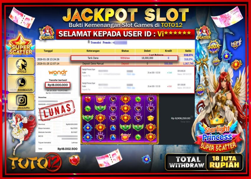 Selamat kepada Member Kami Vi****** Telah Jackpot dan berhasil mendapatkan kemenangan besar pada permainan JACKPOT SLOT GAME (STARLIGHT PRINCESS SUPER SCATTER)  Dengan Kemenangan Sebesar Rp.18.000.000 –.