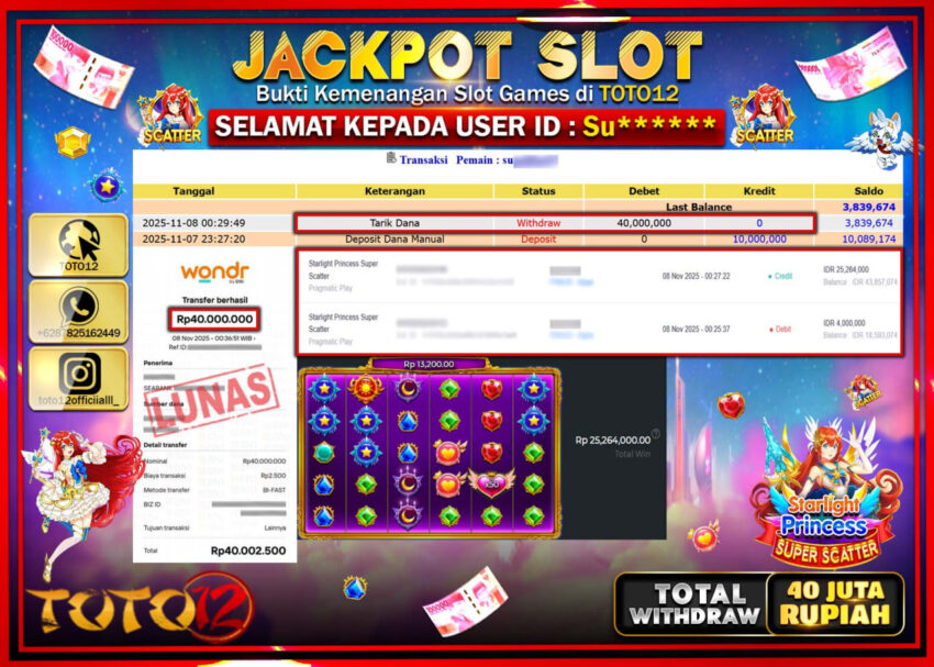 Selamat kepada Member Kami Su****** Telah Jackpot dan berhasil mendapatkan kemenangan besar pada permainan JACKPOT SLOT GAME (STARLIGHT PRINCESS SUPER SCATTER)  Dengan Kemenangan Sebesar Rp.40.000.000 –.  Setelah mengisi Fomulir Withdraw dengan Kurang waktu 1-2 Menit Dana sudah kami Trasnfer kepada Pemilik Userid dan dana sudah dapat di cairkan oleh pemenang. Bukti Pembayaran yang TOTO12 berikan merupakan Bukti Pembayaran yang  SAH / VALID yang langsung Di dapatkan melalui transaksi dari Bank yang di Tunju.