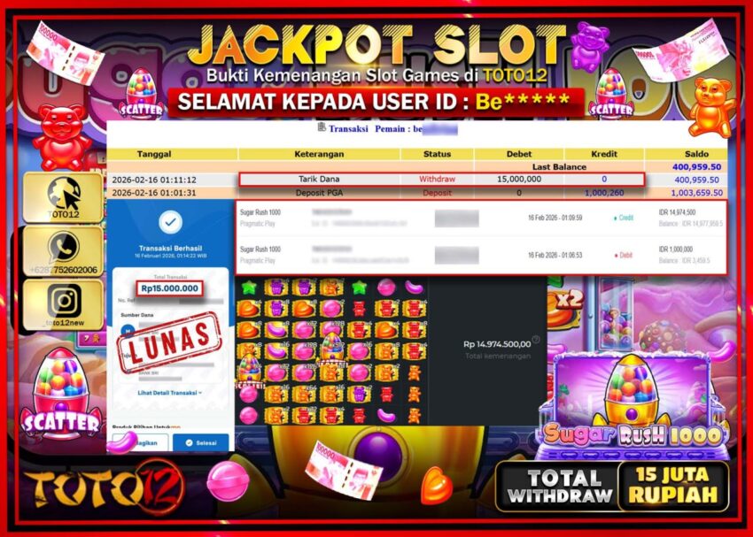 Selamat kepada Member Kami Be****** Telah Jackpot dan berhasil mendapatkan kemenangan besar pada permainan JACKPOT SLOT GAME (SUGAR RUSH 1000) Dengan Kemenangan Sebesar Rp.15.000.000–.