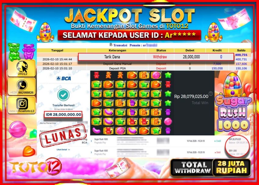 Selamat kepada Member Kami Ar***** Telah Jackpot dan berhasil mendapatkan kemenangan besar pada permainan JACKPOT SLOT GAME (Sugar Rush 1000) Dengan Kemenangan Sebesar Rp.28.000.000–.