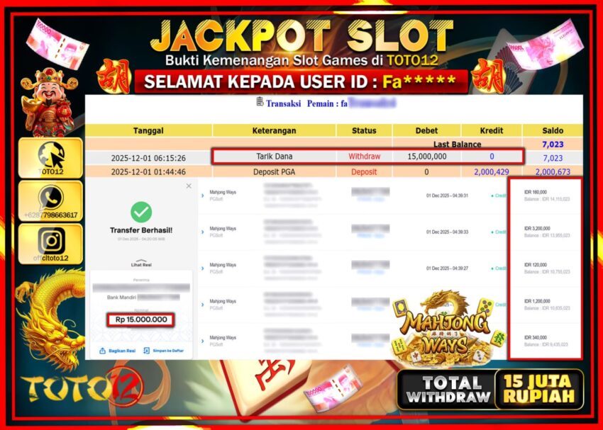 Selamat kepada Member Kami Fa****** Telah Jackpot dan berhasil mendapatkan kemenangan besar pada permainan JACKPOT SLOT GAME (MAHJONG WAYS)  Dengan Kemenangan Sebesar Rp.15.000.000 –.
