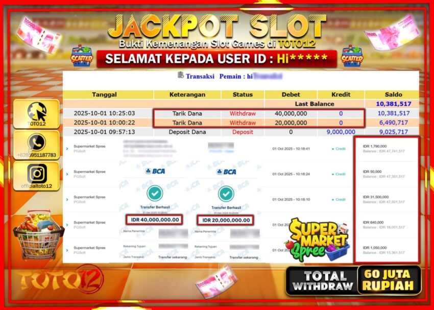 Selamat kepada Member Kami Hi****** Telah Jackpot dan berhasil mendapatkan kemenangan besar pada permainan JACKPOT SLOT GAME (SUPERMARKET SPREE)  Dengan Kemenangan Sebesar Rp.60.000.000 –.  Setelah mengisi Fomulir Withdraw dengan Kurang waktu 1-2 Menit Dana sudah kami Trasnfer kepada Pemilik Userid dan dana sudah dapat di cairkan oleh pemenang. Bukti Pembayaran yang TOTO12 berikan merupakan Bukti Pembayaran yang  SAH / VALID yang langsung Di dapatkan melalui transaksi dari Bank yang di Tunju.