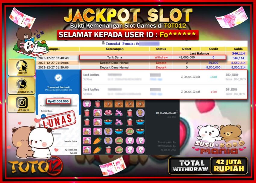 Selamat kepada Member Kami Fo****** Telah Jackpot dan berhasil mendapatkan kemenangan besar pada permainan JACKPOT SLOT GAME (SUSU & KOKO MANIA) Dengan Kemenangan Sebesar Rp.42.000.000 –.
