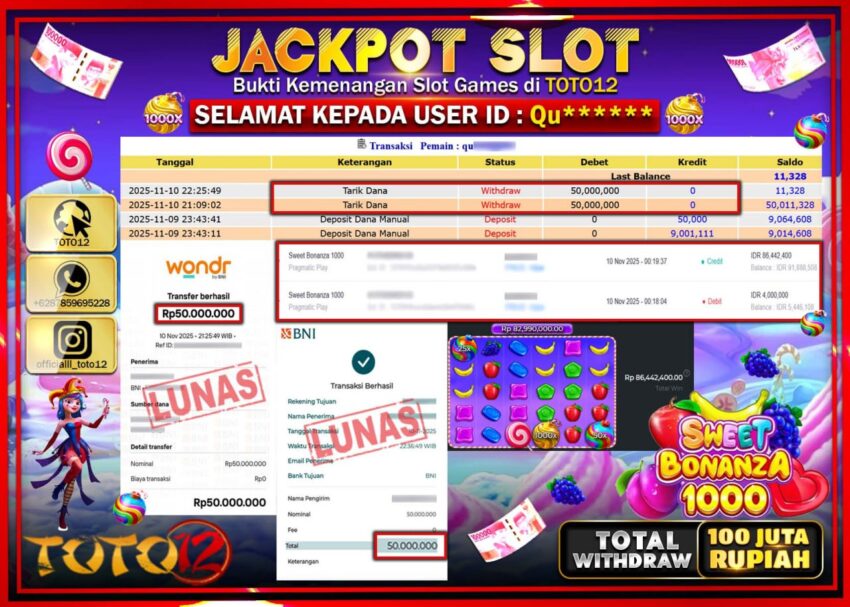 Selamat kepada Member Kami Qu****** Telah Jackpot dan berhasil mendapatkan kemenangan besar pada permainan JACKPOT SLOT GAME (SWEET BONANZA 1000) Dengan Kemenangan Sebesar Rp.100.000.000 –. Setelah mengisi Fomulir Withdraw dengan Kurang waktu 1-2 Menit Dana sudah kami Trasnfer kepada Pemilik Userid dan dana sudah dapat di cairkan oleh pemenang. Bukti Pembayaran yang TOTO12 berikan merupakan Bukti Pembayaran yang SAH / VALID yang langsung Di dapatkan melalui transaksi dari Bank yang di Tunju.