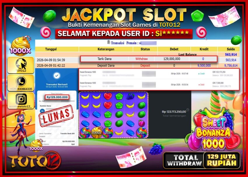 Selamat kepada Member Kami Si***** Telah Jackpot dan berhasil mendapatkan kemenangan besar pada permainan JACKPOT SLOT GAME  (SWEET BONANZA 1000)  Dengan Kemenangan Sebesar Rp.129.000.000–.