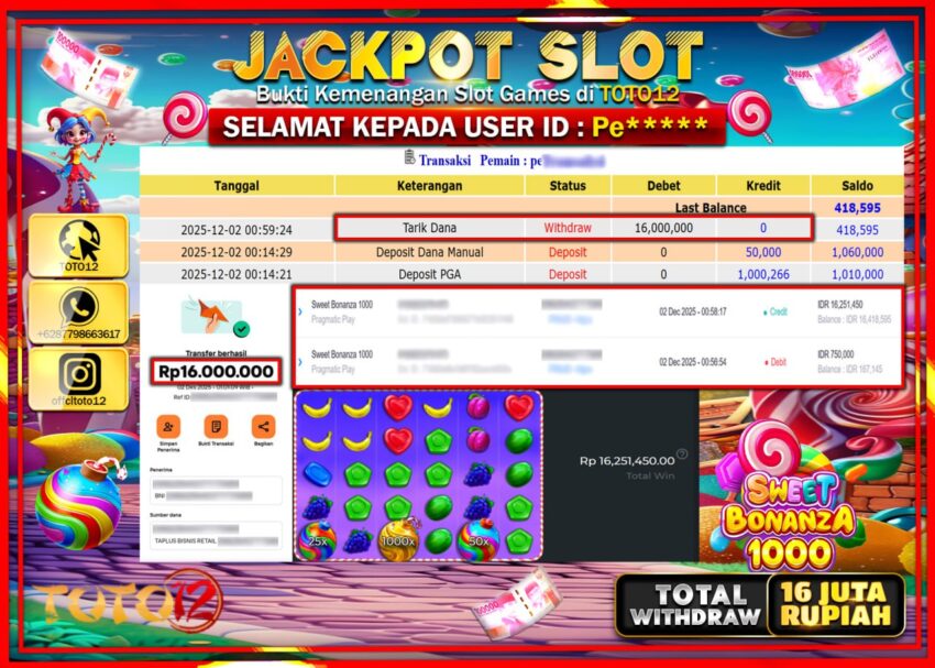Selamat kepada Member Kami Pe****** Telah Jackpot dan berhasil mendapatkan kemenangan besar pada permainan JACKPOT SLOT GAME (SWEET BONANZA 1000) Dengan Kemenangan Sebesar Rp.16.000.000 –.